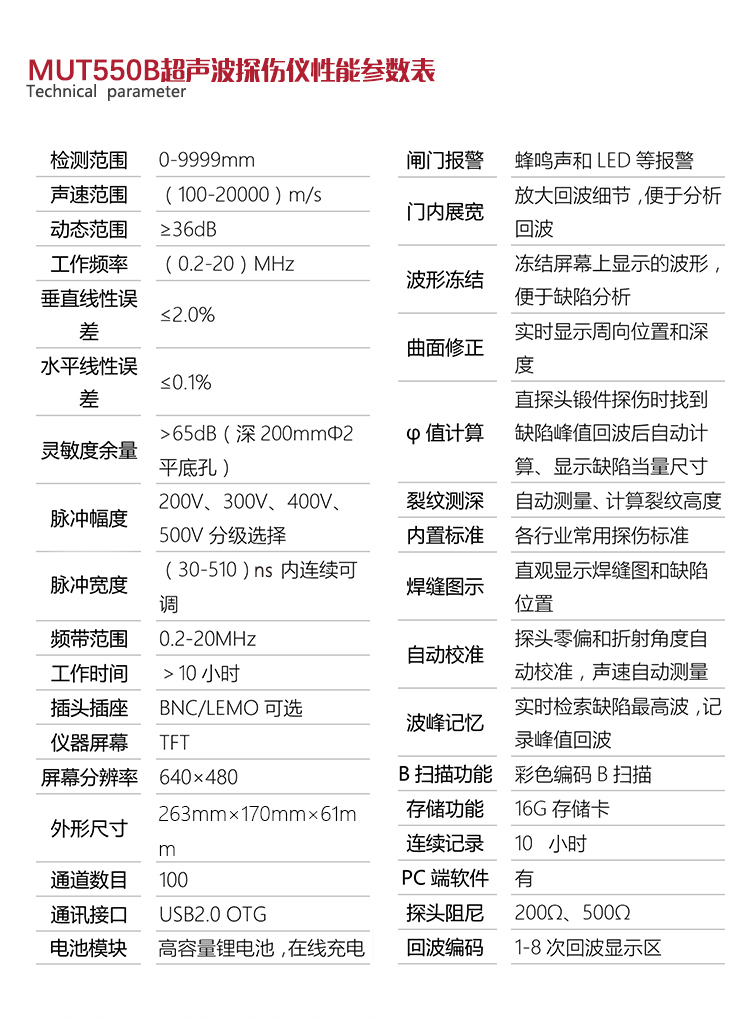 產(chǎn)品概述MUT550B數(shù)字式超聲波探傷儀依據(jù)超聲傳播原理,可精準(zhǔn)、靈敏地進(jìn)行工件內(nèi)部多種缺陷(裂紋、夾雜、氣孔等)的檢測(cè)、定位、評(píng)估和診斷。采用全數(shù)字TFT640×480真彩色液晶顯示屏,在光線昏暗及日光強(qiáng)烈環(huán)境下都能為您呈現(xiàn)清晰缺陷;0-9999mm大量程可滿足制造業(yè)、鋼鐵冶金業(yè)、金屬加工業(yè)、化工業(yè)等常規(guī)的缺陷檢測(cè)需求;低功耗設(shè)計(jì)配備大容量高性能鋰離子電池模塊可連續(xù)工作10小時(shí)以上;全中文主從式菜單,注重用戶體驗(yàn),集快捷按鍵、數(shù)碼飛梭旋輪、十字菜單三種操作方式于一體,不同使用習(xí)慣均可操作自如;設(shè)有綜合性能指標(biāo)自檢功能,可自動(dòng)生成測(cè)試報(bào)告,支持多語(yǔ)言。該產(chǎn)品具有很高的性價(jià)比,是實(shí)用經(jīng)濟(jì)款超聲檢測(cè)儀器的明智之選。